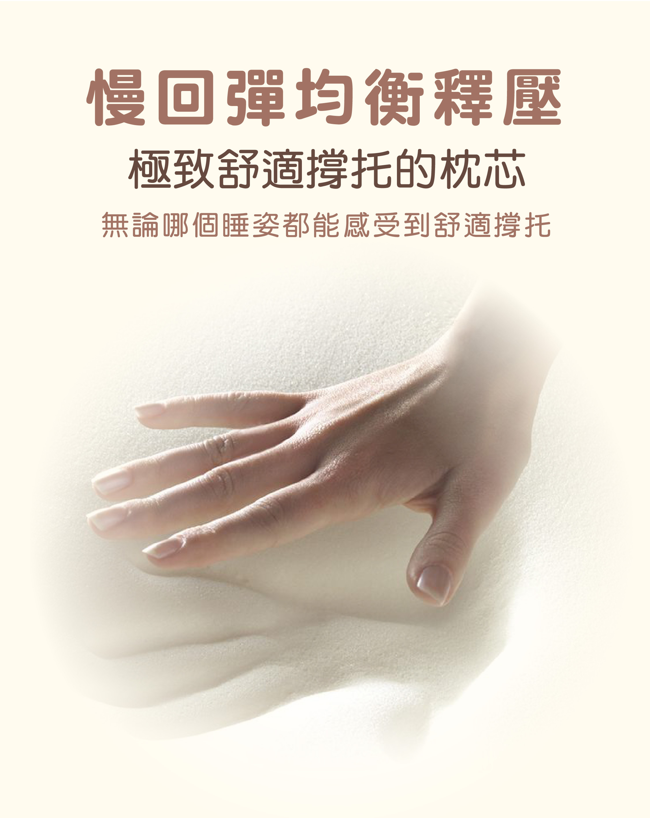 幫助您在睡眠時,釋放頭部及頸部的重力負擔,解決變換姿勢頭頸部肌肉 無法獲得支撐的困擾,有助於不同睡姿的肌肉舒緩。