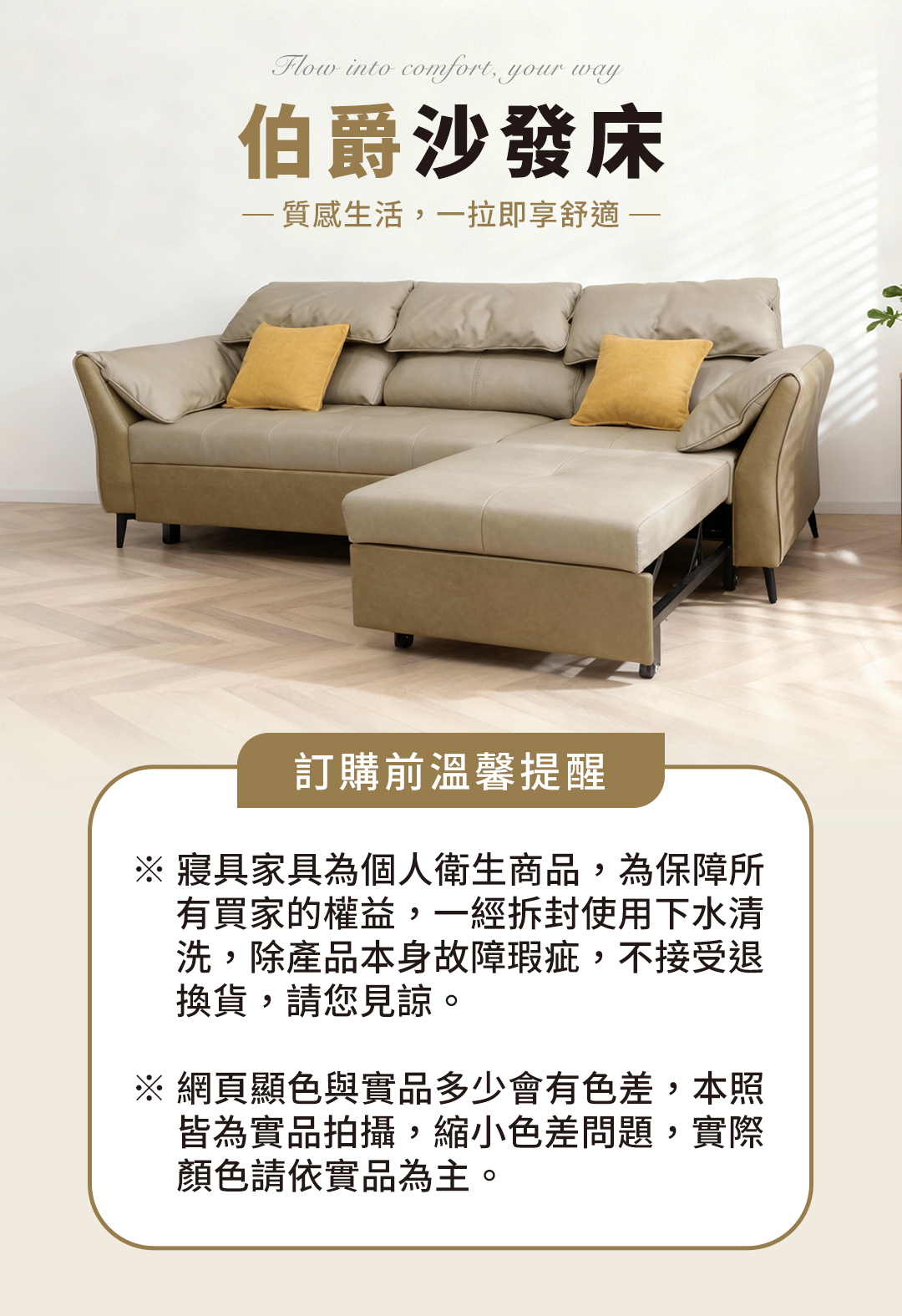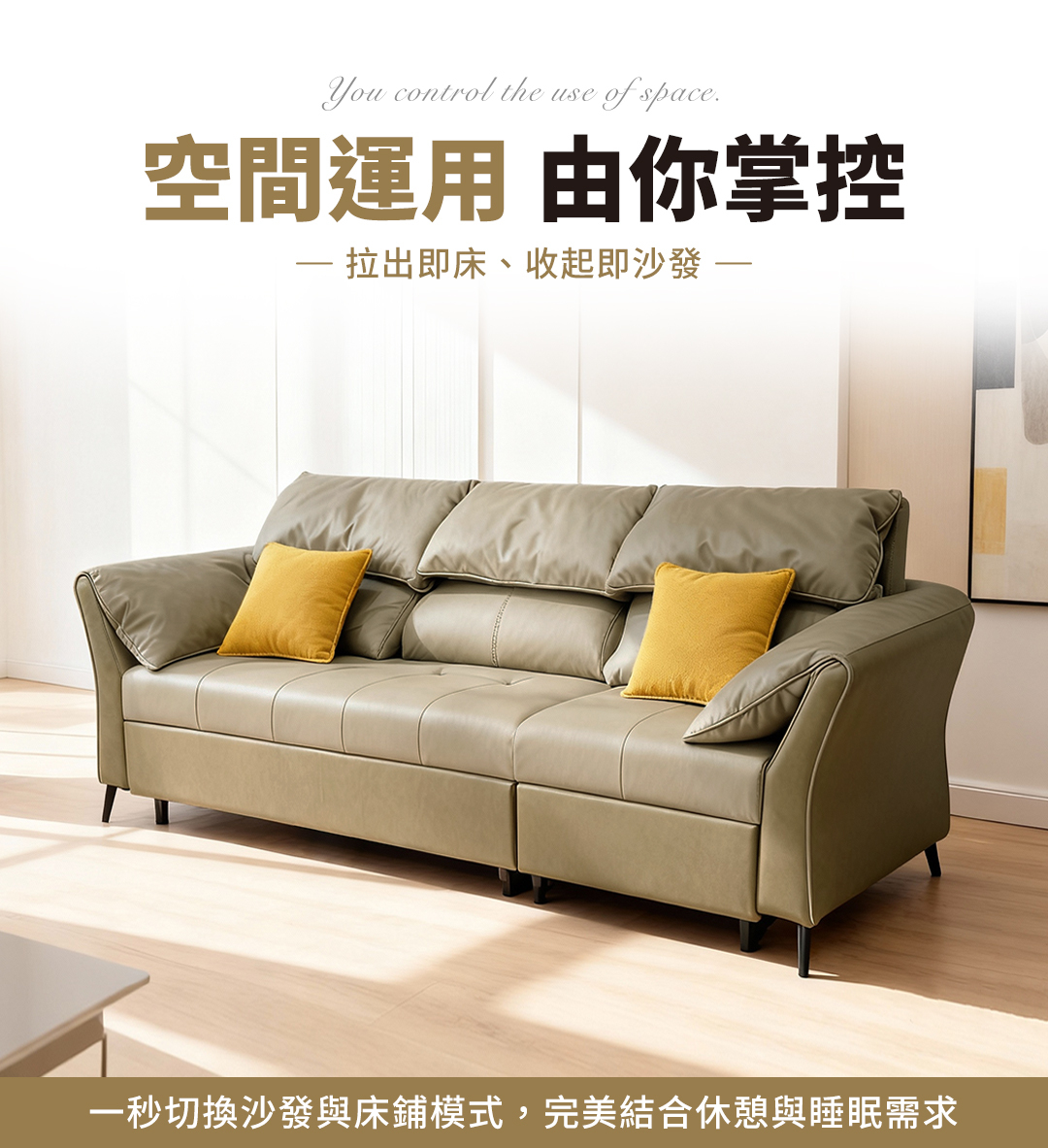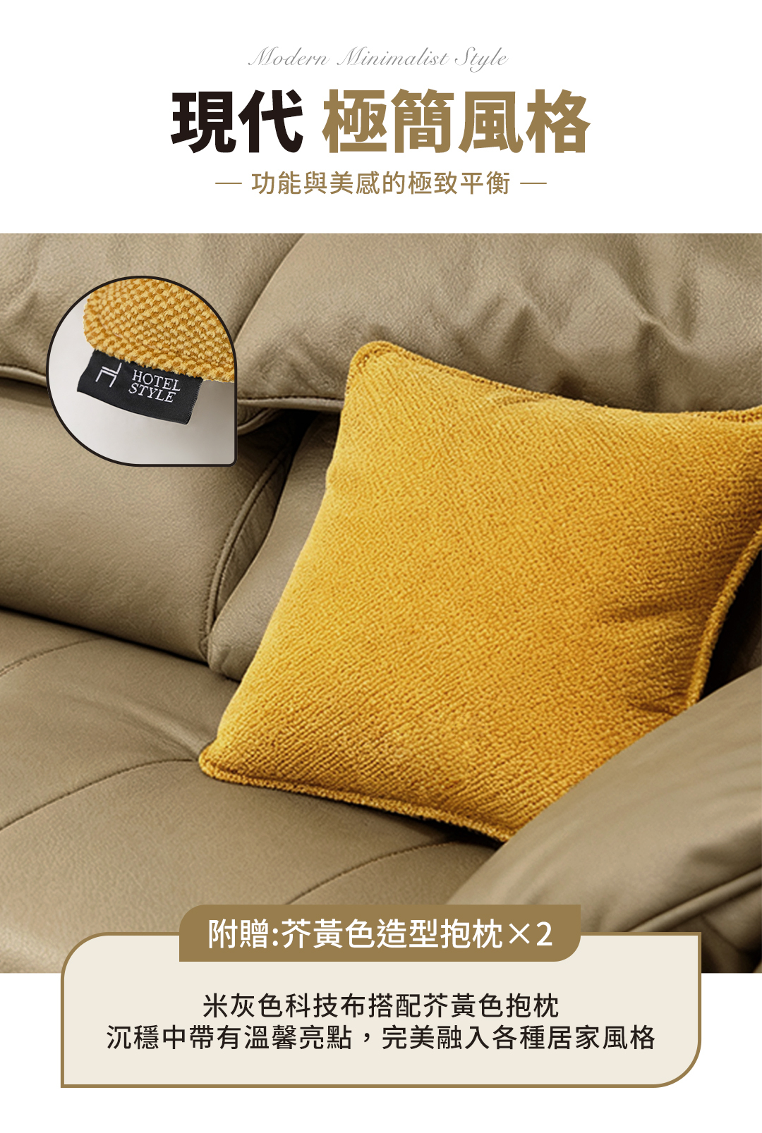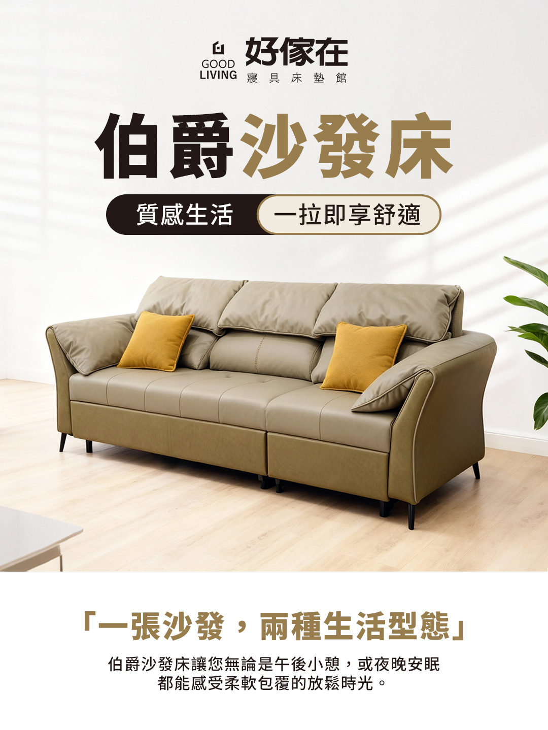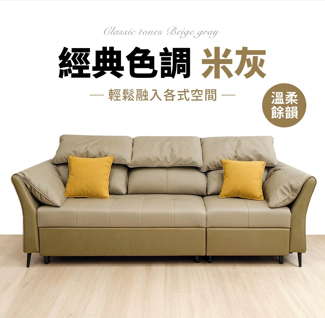 伯爵沙發床採用高質感科技布材質,搭配亮眼的芥黃色抱枕,增添視覺層次與溫馨氛圍。