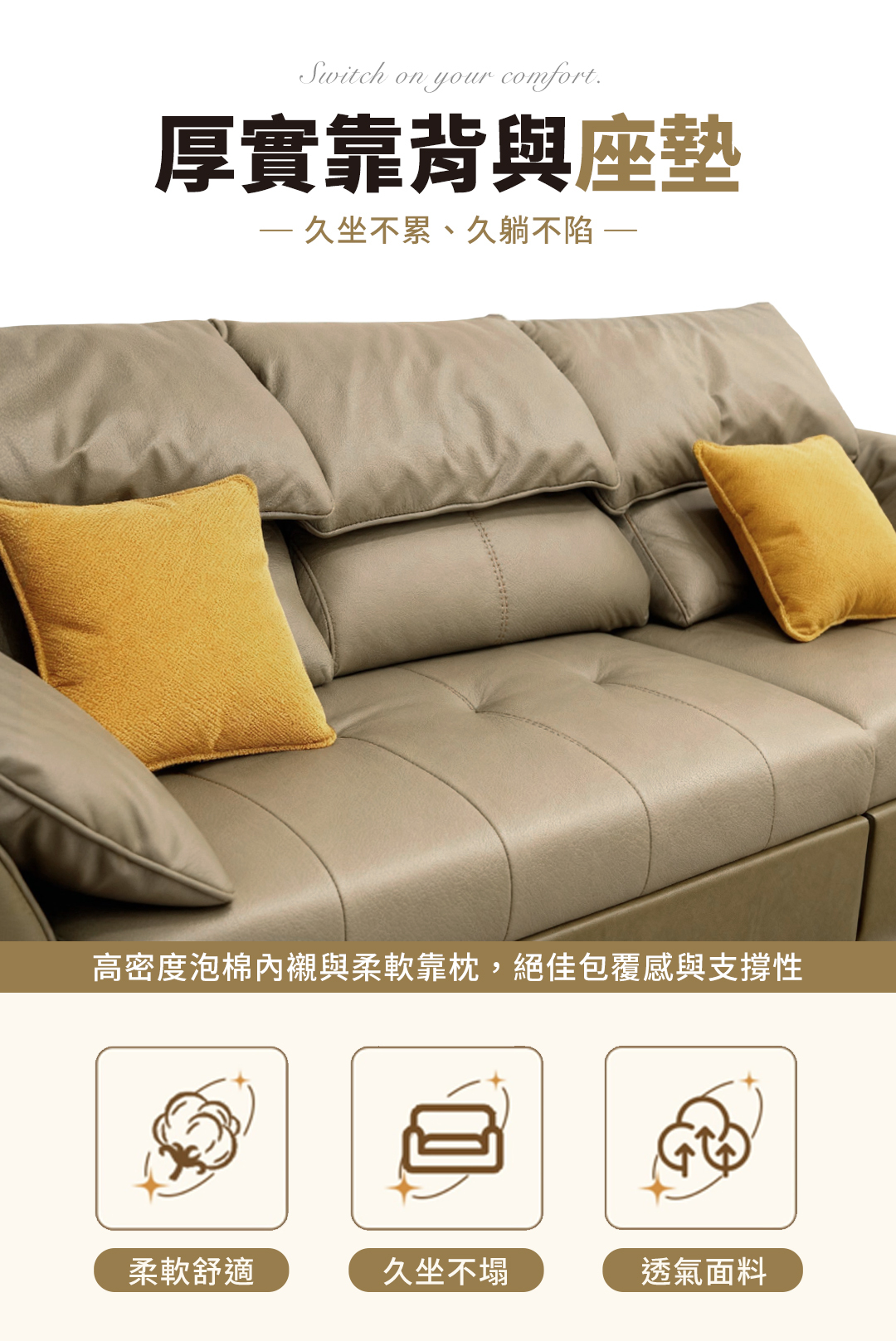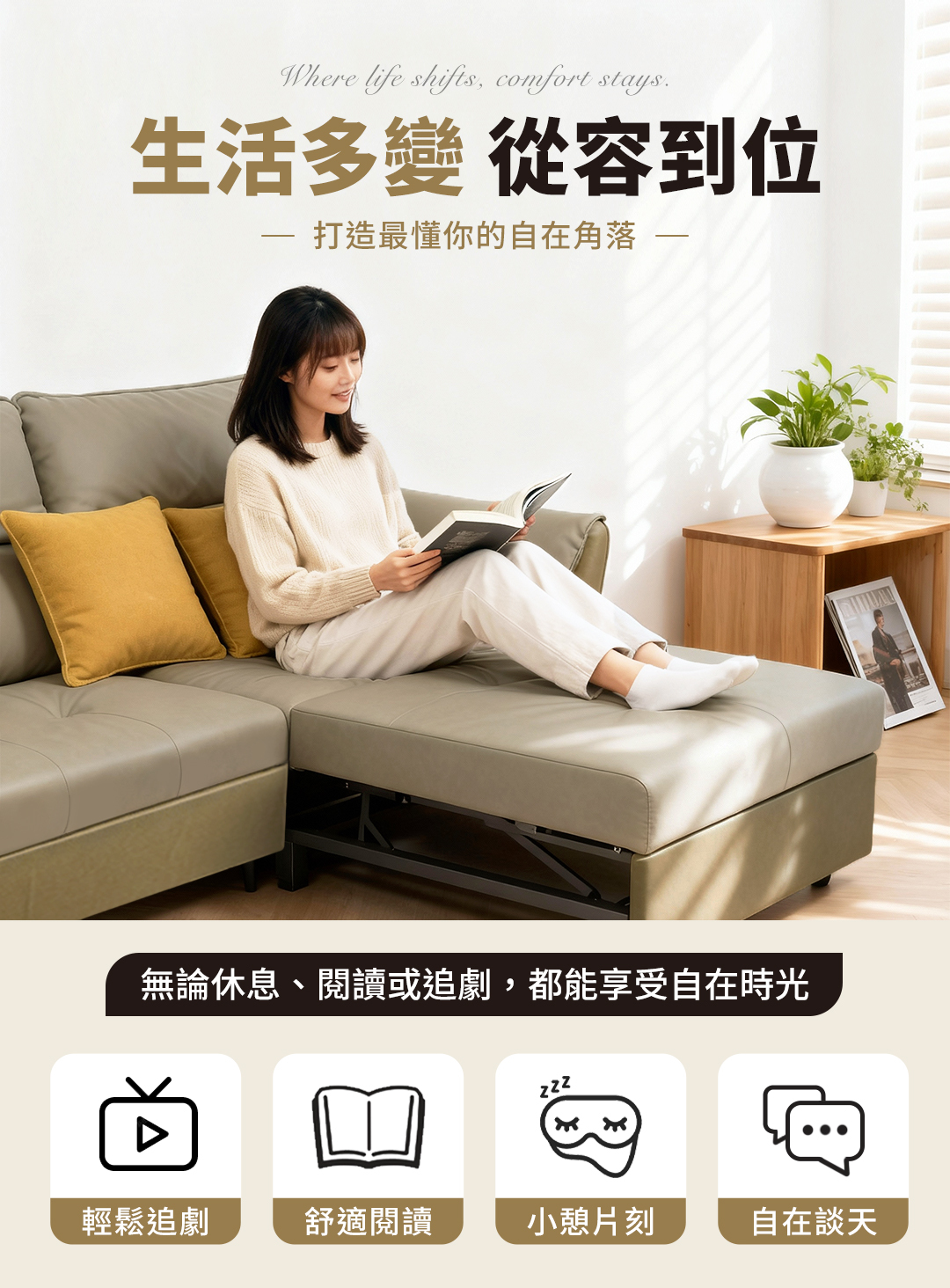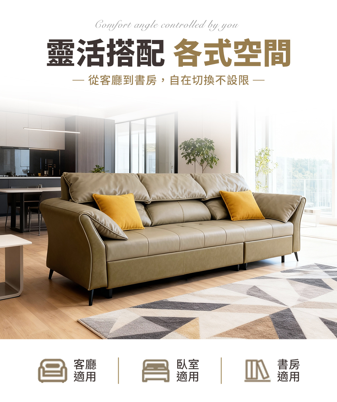 舒適靠背與寬大扶手設計,讓您無論是坐、躺、睡皆能感受到極致放鬆。