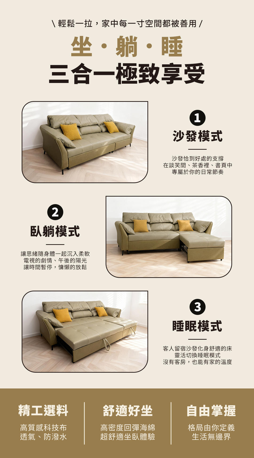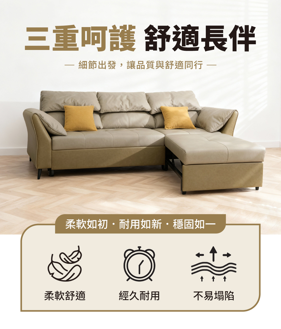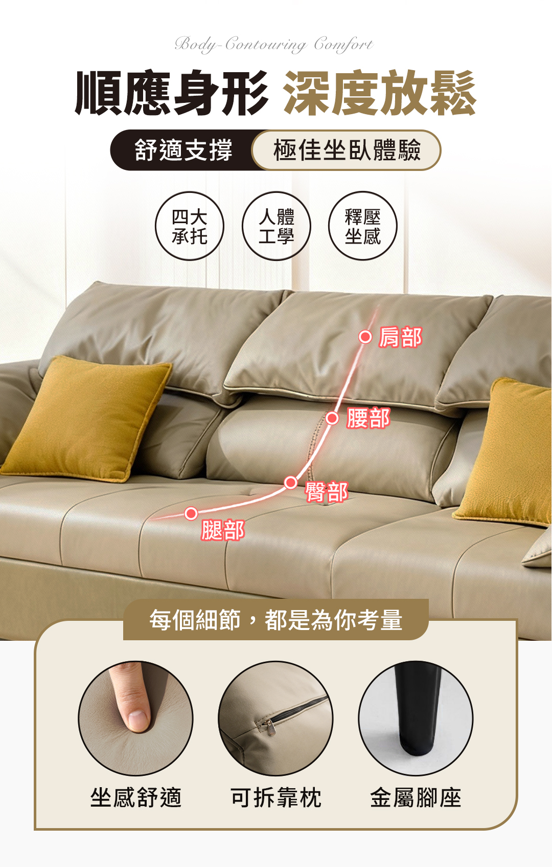 舒適靠背與寬大扶手設計,讓您無論是坐、躺、睡皆能感受到極致放鬆。