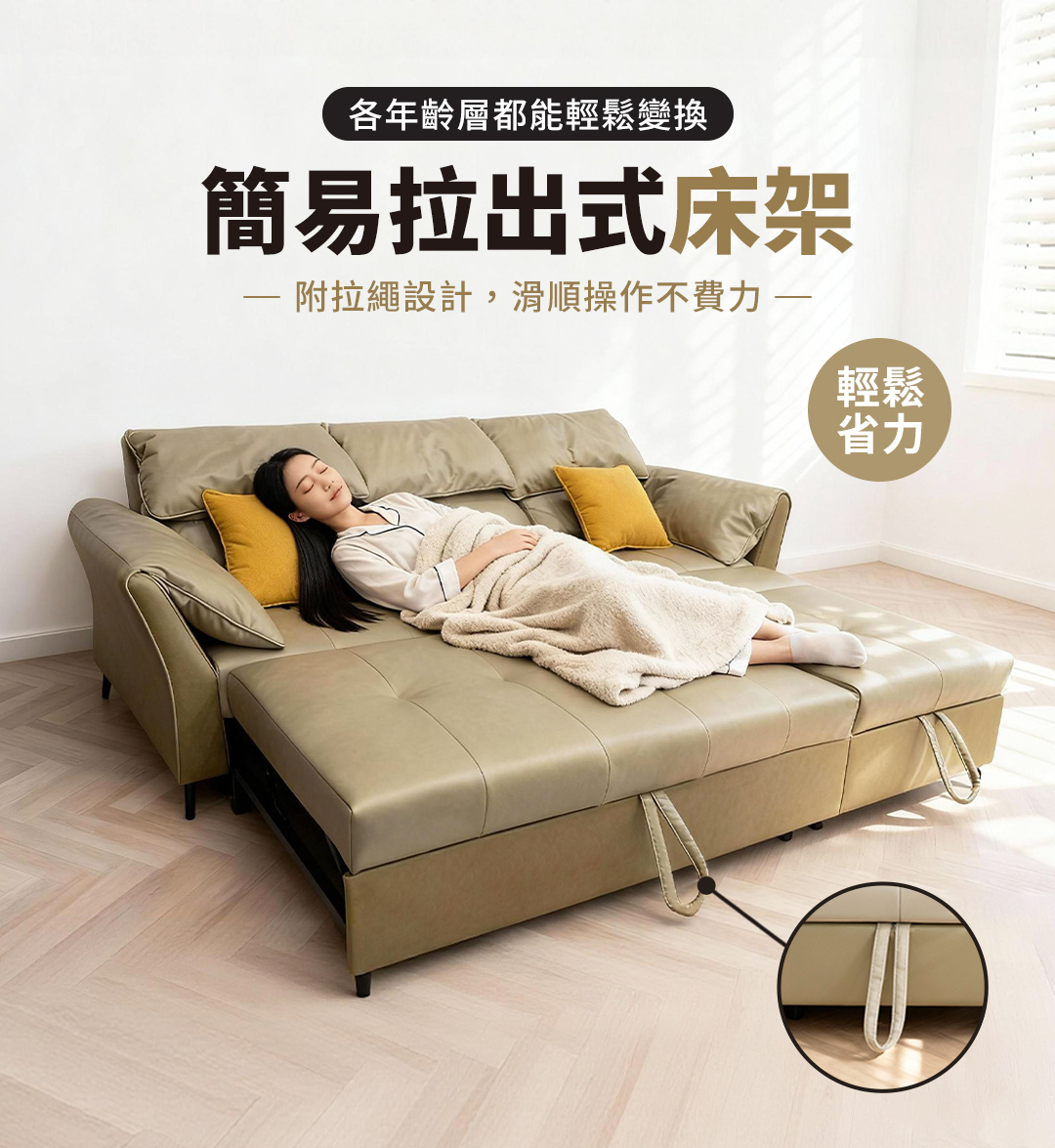 沙發可輕鬆拉出變成床鋪設計,為小坪數住宅或有臨時客人造訪時提供完美解方。