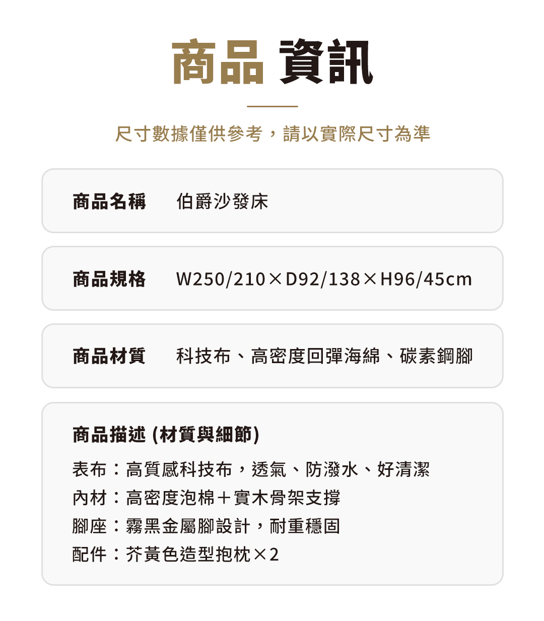 | 材質 | 科技布、高密度回彈海綿、碳素鋼腳 |
